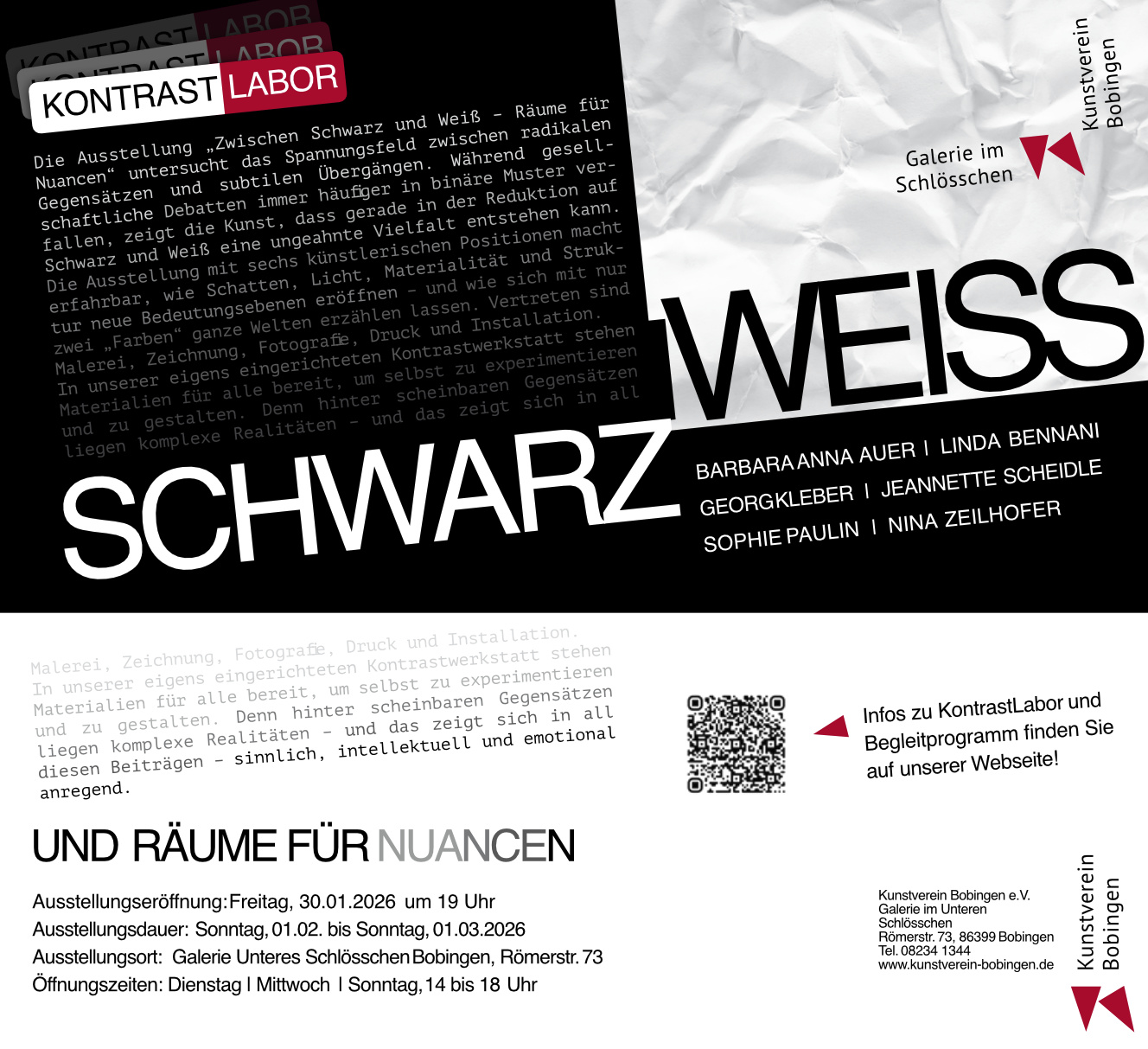 Die Ausstellung mit sechs künstlerischen Positionen macht erfahrbar, wie Schatten, Licht, Materialität und Struktur neue Bedeutungsebenen eröffnen – und wie sich mit nur zwei „Farben“ ganze Welten erzählen lassen. Vertreten sind Malerei, Zeichnung, Fotografie, Druck und Installation. In unserer eigens eingerichteten Kontrastwerkstatt stehen Materialien für alle bereit, um selbst zu experimentieren und zu gestalten. Denn hinter scheinbaren Gegensätzen liegen komplexe Realitäten – und das zeigt sich in all Malerei, Zeichnung, Fotografie, Druck und In unserer eigens eingerichteten Kontrastwerkstatt stehen Materialien für alle bereit, um selbst zu experimentieren und zu gestalten. Denn hinter scheinbaren Gegensätzen liegen komplexe Realitäten – und das zeigt sich in all diesen Beiträgen – sinnlich, intellektuell und emotional anregend.