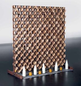 Dem aufragenden, annähernd quadratischen aus Flacheisen geschweißtem Raster der Installation sind vergleichbar einem Altar, Milchflaschen und Honiggläser in regelmäßigen Abständen auf beiden Seiten