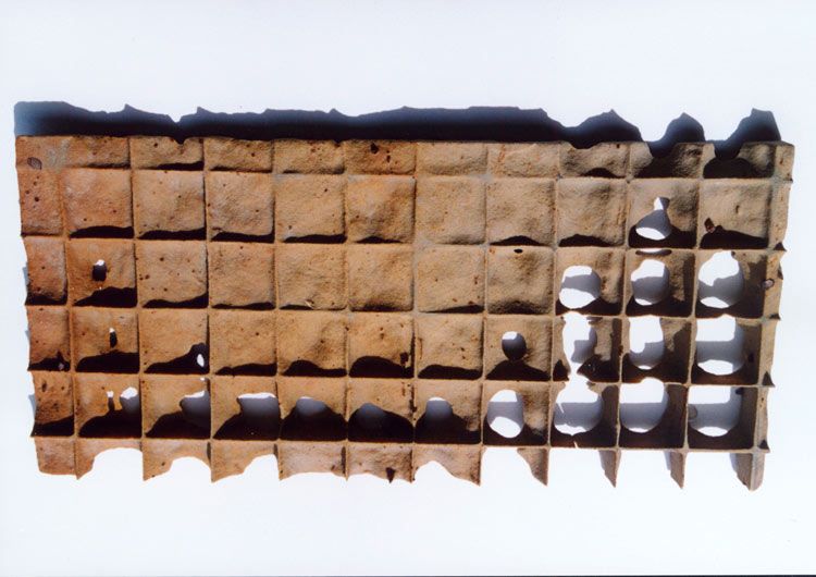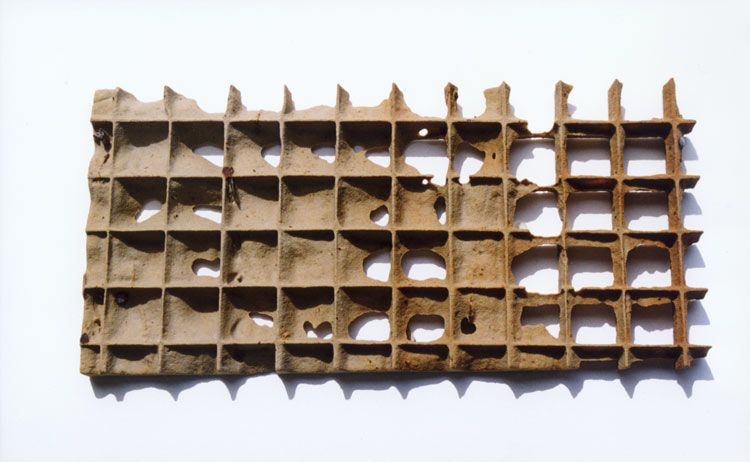 Christine Gräpers gerahmtes Objekt wirkt auf den ersten Blick konservativ, im eigentlichen Sinne des Wortes ´bewahrend`. Als präsentiere sie ein antikes Fundstück oder einen archäologischen Bodenfund, den sie im Kastenrahmen sorgfältig geschützt zeigt.