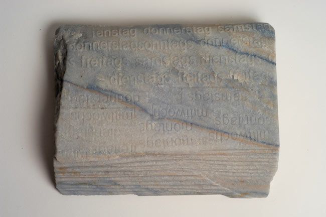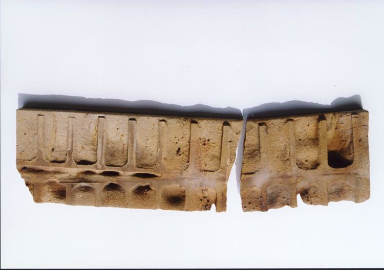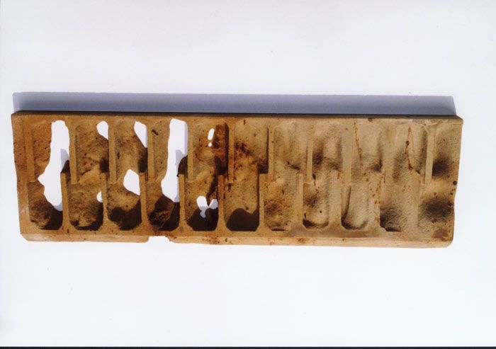 Das Relief aus historisch wirkendem Material erinnert an architektonische Elemente, entzieht sich aber der formalen Deutbarkeit.