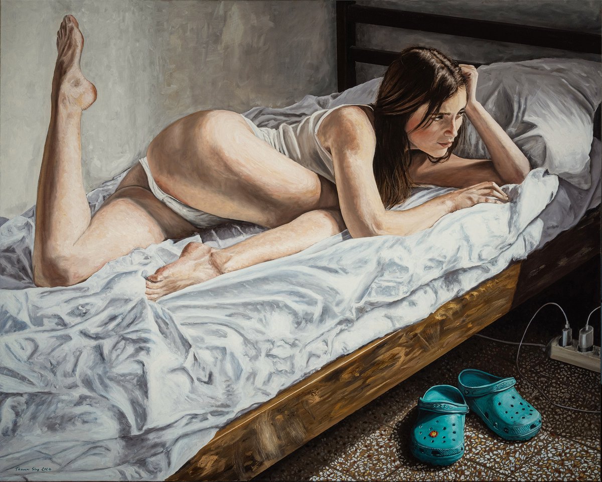 Sie inszeniert ihre Bildräume nicht narrativ, sondern psychologisch: Die Kompositionen laden ein zur stillen Beobachtung, lassen aber Deutung und Assoziation bewusst offen. Körper werden nicht idealisiert, sondern als Träger von Erfahrung und Spannung gezeigt.