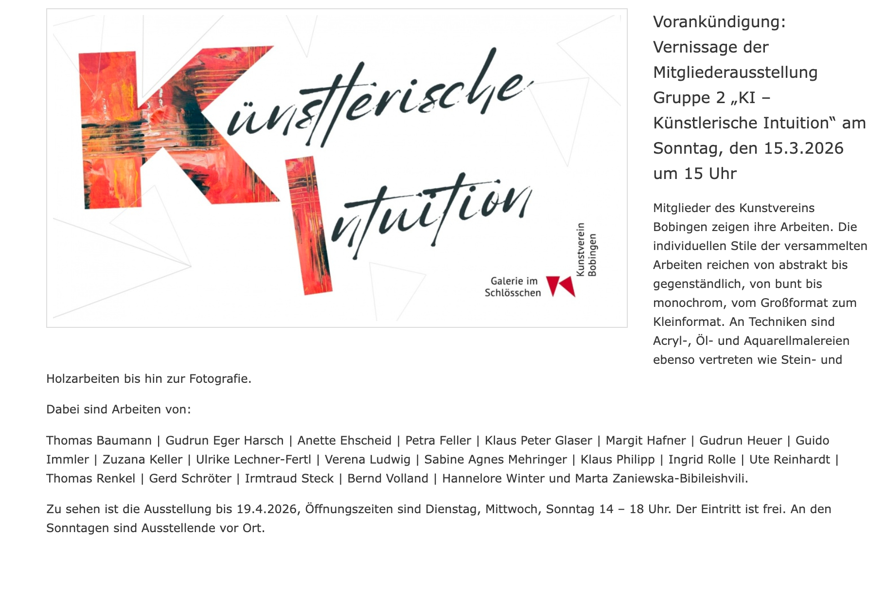 Vernissage der Mitgliederausstellung Gruppe 2 „KI – Künstlerische Intuition“ am Sonntag, den 15.3.2026 um 15 Uhr