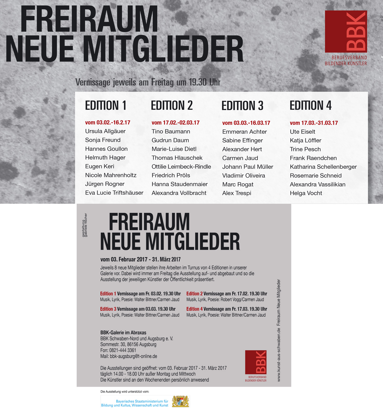 Edition IV: 17. März Die Vernissagen werden begleitet durch Musik, Lyrik und Poesie von Walter Bittner, Robert Vogg und Carmen Jaud. BBK-Galerie im Kulturhaus abraxas, Augsburg