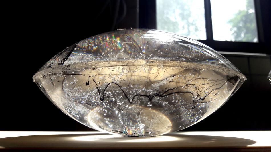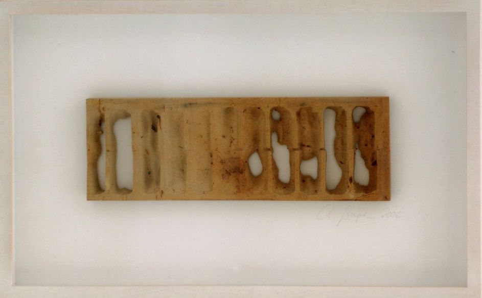 Christine Gräpers gerahmtes Objekt wirkt auf den ersten Blick konservativ, im eigentlichen Sinne des Wortes ´bewahrend`. Als präsentiere sie ein antikes Fundstück oder einen archäologischen Bodenfund, den sie im Kastenrahmen sorgfältig geschützt zeigt.